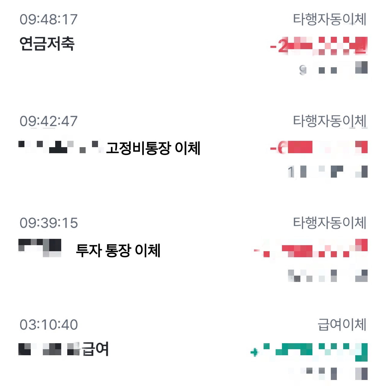 대부분의 은행 앱에서 '자동이체 설정'을 지원한다. 월급일 기준으로 +1일 혹은 +2일로 설정해두면 월급이 들어온 직후 바로 저축&투자, 고정비 통장으로 빠진다.